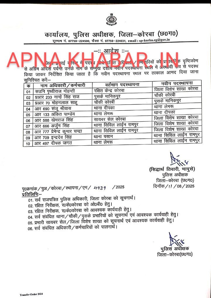 एक्सक्लूसिव कोरबा बिग ब्रेकिंग,,, अभी अभी आदेश हुआ जारी,,,, 10 पुलिस कर्मियों का हुआ तबादला admin Admin posted on 5 months ago 717 views 1 ASI, 2 प्रधान आरक्षक, 7आरक्षक अभी अभी SP ने आदेश KIYA जारी NA YOUR REACTION? 0 AWESOME! 0 NICE 0 LOVED 0 LOL 0 FUNNY 0 FAIL! 0 OMG! 0 EW!