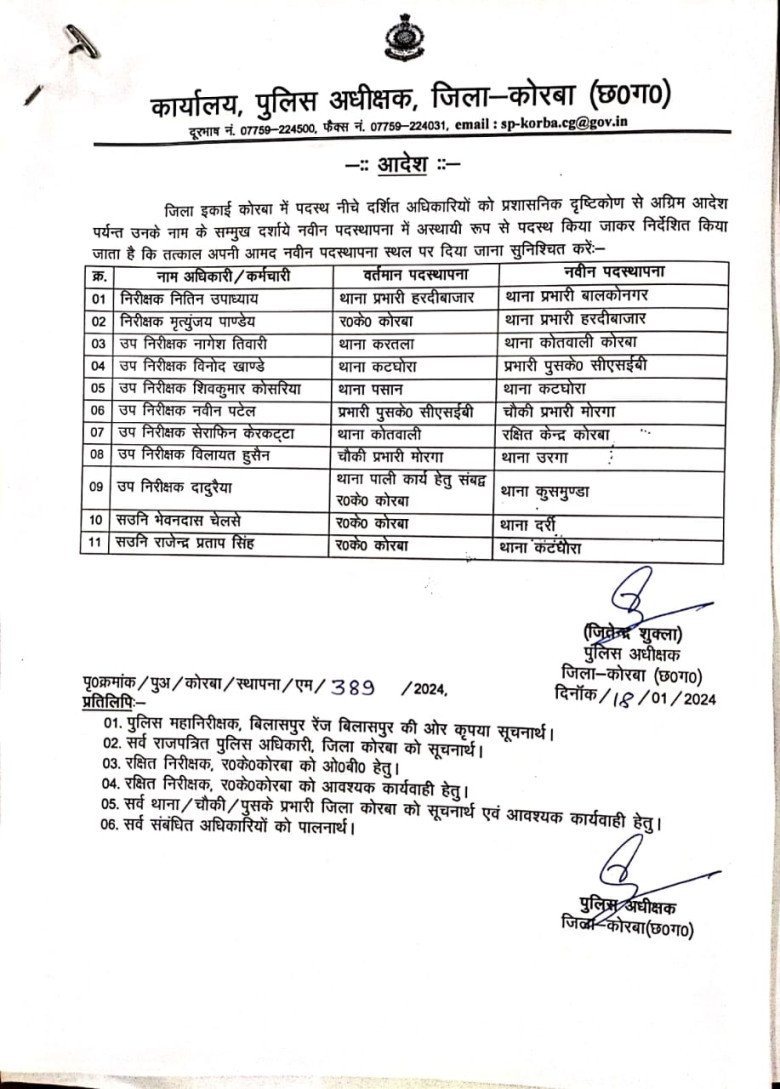 ब्रेकिंग कोरबा पुलिस विभाग में बड़ा फेरबदल थाना प्रभारी चौकी प्रभारी देखिए आदेश