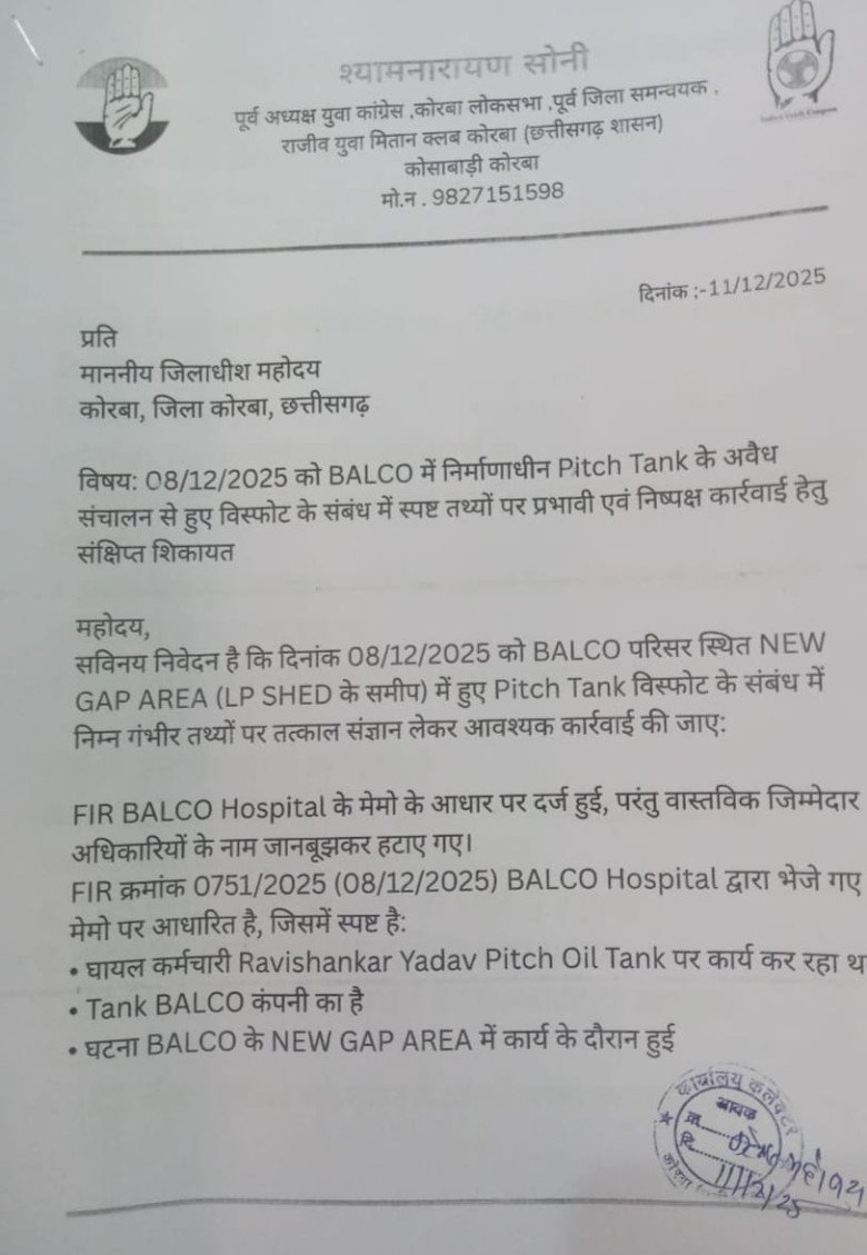 श्यामनारायण सोनी जी द्वारा यह पत्र जिला कलेक्टर, कोरबा को व्यक्तिगत रूप से सौंपा गया, जिसमें BALCO प्रबंधन के विरुद्ध निष्पक्ष कार्रवाई की मांग की गई। BALCO Pitch Tank विस्फोट—दोषियों को बचाने का प्रयास, CEO व Factory Manager पर FIR की मांग