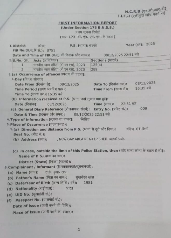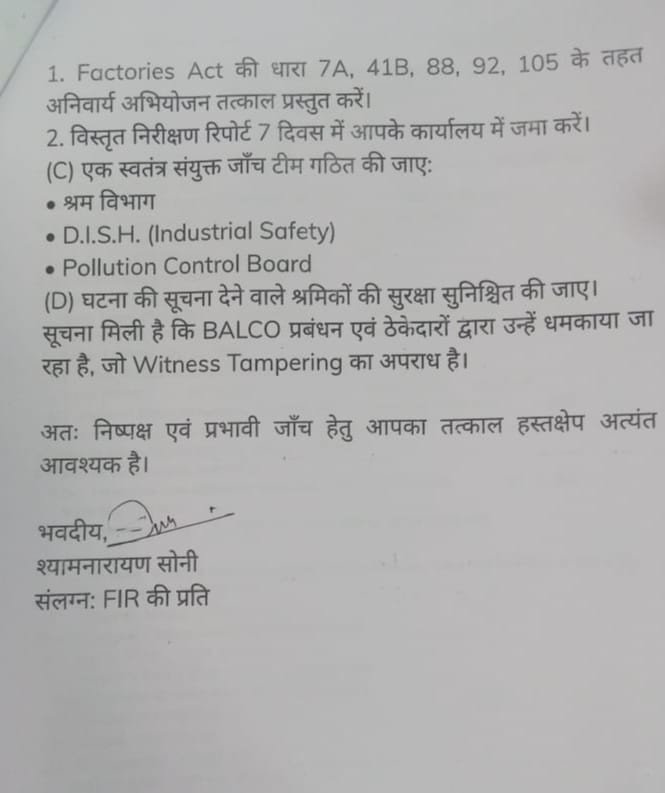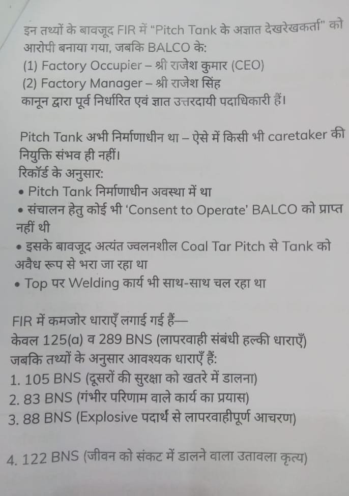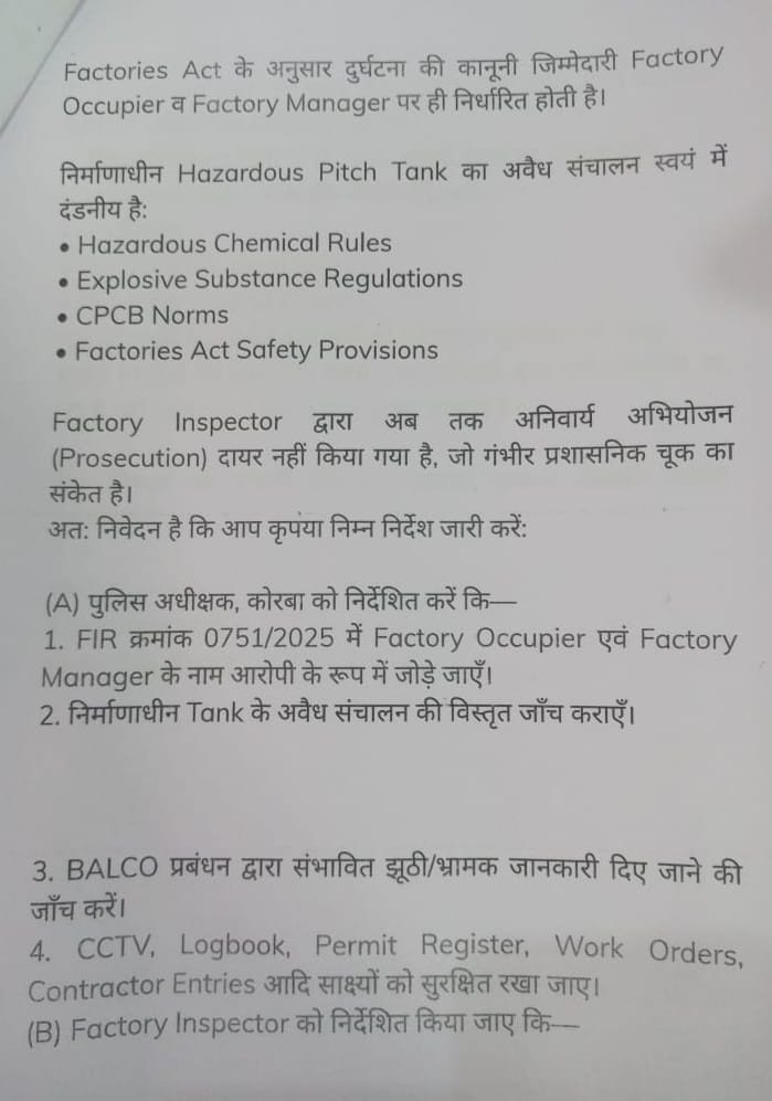 FIR क्र. 0751/2025 में BALCO CEO एवं Factory Manager को आरोपी के रूप में जोड़ा जाए।