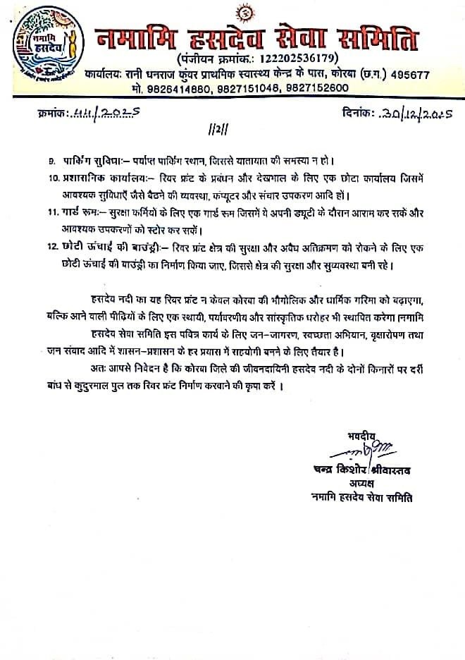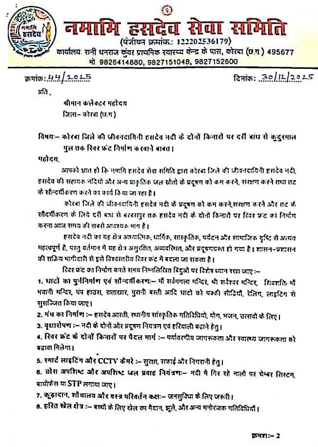 कुणाल दुदावत, कलेक्टर कोरबा को नमामि हसदेव सेवा समिति द्वारा हसदेव नदी के दोनों किनारों पर दर्री बाँध से कुदूरमाल पुल तक रिवर फ्रंट निर्माण के लिए मांग पत्र दिया गया।*