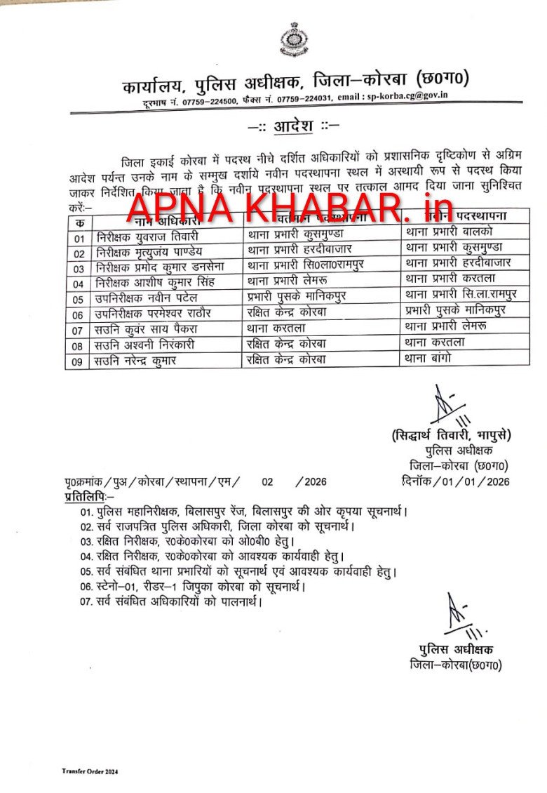 कोरबा पुलिस अधीक्षक सिद्धार्थ तिवारी ने विभागीय फेरबदल aकरके नए साल का तोहफा दिया है कौन कहां गया देखिए सूची