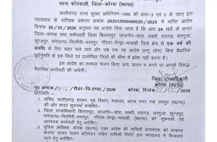 आदेश के तहत दोनों आरोपियों को कोरबा के साथ बिलासपुर, जांजगीर-चांपा, सक्ती, रायगढ़, सरगुजा, सूरजपुर, मनेन्द्रगढ़-चिरमिरी-भरतपुर और गौरेला-पेण्ड्रा-मरवाही जिलों की राजस्व सीमाओं से एक वर्ष तक बाहर रहना होगा।