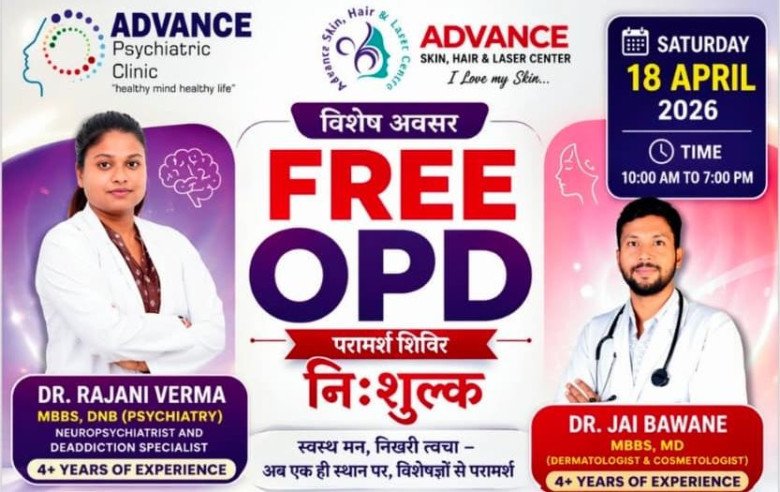 कोरबा। शहर के निहारिका क्षेत्र स्थित एडवांस्ड डायग्नोस्टिक सेंटर में शनिवार 18 अप्रैल को एक दिवसीय निशुल्क स्वास्थ्य परीक्षण शिविर का आयोजन किया जा रहा है। यह शिविर सुबह 10:00 बजे से शाम 7:00 बजे तक आयोजित होगा, जिसमें अहमदाबाद की प्रख्यात न्यूरो-साइकेट्रिक विशेषज्ञ डॉ. रजनी वर्मा एवं त्वचा रोग विशेषज्ञ एवं कॉस्मेटोलॉजिस्ट डॉ. जय बावने अपनी सेवाएं प्रदान करेंगे।