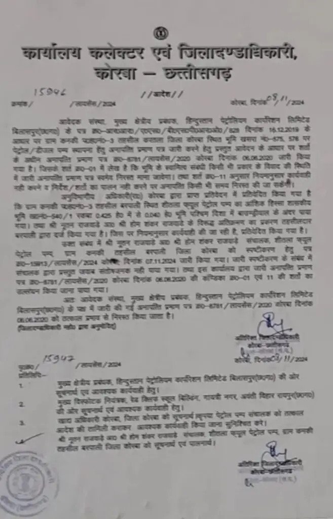 जारी पत्र में उल्लेख किया गया है कि आवेदक संस्था, मुख्य क्षेत्रीय प्रबंधक, हिन्दुस्तान पेट्रोलियम कार्पोरेशन लिमिटेड बिलासपुर (छ०ग०) के पत्र क्र० आर०आर०/ए०एस०/ बी०एस०पी०आर०ओ०/828 दिनांक 16.12.2019 के आधार पर ग्राम कनकी प०ह०नं०-3 तहसील करतला जिला कोरबा स्थित भूमि खसरा नं0-575, 576 पर पेट्रोल/डीजल पम्प स्थापना हँतु अनापत्ति प्रमाण पत्र जारी करने हेतु प्रस्तुत आवेदन के आधार पर शर्तों के अधीन अनापत्ति प्रमाण पत्र क्र0-8781/लायसेंस/2020 कोरबा दिनांक 06.06.2020 जारी किया गया है। जिसके शर्त क्र0-01 में लेख है कि भूमि के स्वामित्व संबंधी किसी भी प्रकार के विवाद की स्थिति में जारी अनापत्ति प्रमाण पत्र स्वमेव निरस्त माना जावेगा। तथा शर्त क्र०-11 अनुसार नियमानुसार कार्यवाही नही करने व निर्देश/शर्तों का पालन नही करने पर अनापत्ति किसी भी समय निरस्त की जा सकेंगी।