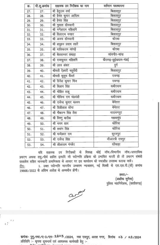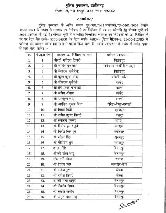 रायपुर/कोरबा। राज्य पुलिस मुख्यालय के द्वारा पदोन्नति योग्यता सूची वर्ष 2024 के अनुसार राज्य के 53 सहायक उप निरीक्षकों को पदोन्नति देकर उप निरीक्षक बनाया है। इसमें कोरबा जिला पुलिस बल में कार्यरत मालिक राम जांगड़े, अजय सोनवानी, राकेश गुप्ता और राजेश तिवारी भी शामिल हैं जिन्हें asi से एसआई पदोन्नत किया गया है। पदोन्नति उपरांत संबंधित सभी 53 si को मौजूदा जिले में ही पदस्थ रखा गया है। इनकी नवीन पदस्थापना का आदेश आगामी दिनों में जारी किया जाएगा।