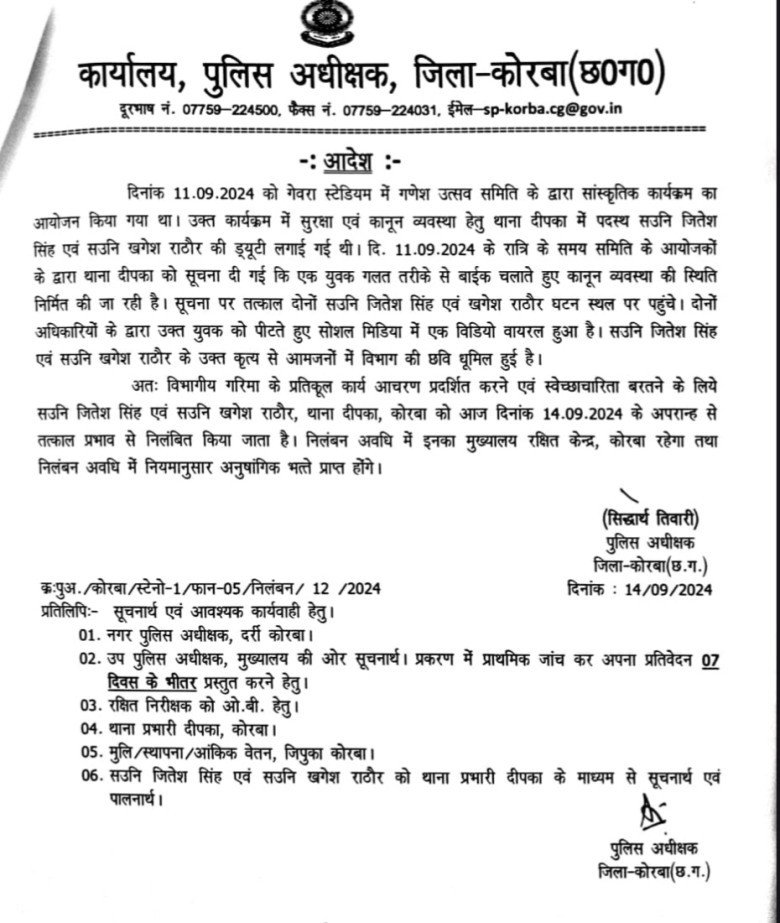 छत्तीसगढ़ पुलिस अधीक्षक सिद्धार्थ तिवारी ने दो सहायक उप-निरीक्षकों (एएसआई) को निलंबित कर दिया है, जो दीपका थाने में तैनात थे। एएसआई जितेश सिंह और खगेश राठौर पर आरोप है कि उन्होंने ड्यूटी के दौरान एक युवक की पिटाई की थी।