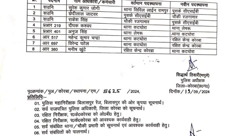 कोरबा। एसपी सिद्दार्थ तिवारी ने 7 पुलिसकर्मियों का तबादला आदेश जारी किया है। जारी आदेश में 3 एएसआई 2 प्रधान आरक्षक और 3 आरक्षक को इधर से उधर किया गया है।
