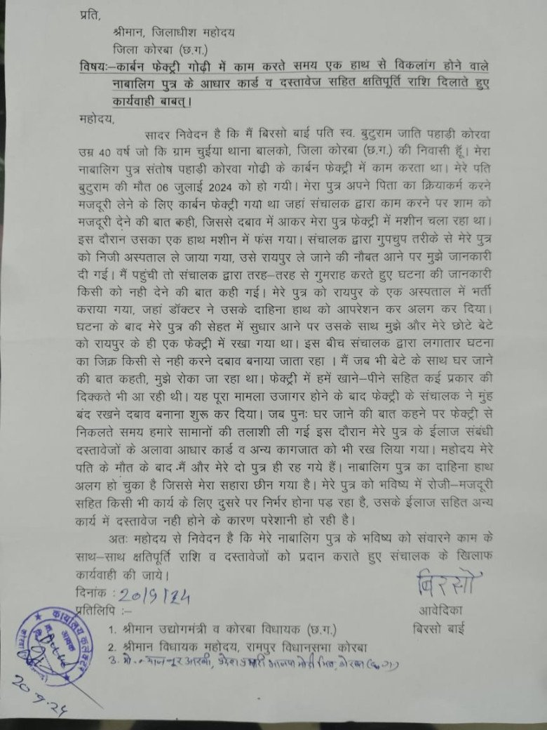 कोरबा। ग्राम गोढ़ी के पास संचालित वेस्टर्न कोक प्रोडक्ट (कार्बन फैक्ट्री) में काम करने के दौरान हादसे में अपना दाहिना हाथ गंवा चुके ग्राम कदमझरिया निवासी नाबालिग पहाड़ी कोरवा ने आज कलेक्टर अजीत वसंत से मुलाकात कर संबंधित फैक्ट्री के विरूद्ध कार्यवाही एवं आजीविका हेतु रोजगार की मांग की। कलेक्टर ने जांच प्रतिवेदन के आधार पर गोढ़ी में संचालित कार्बन फैक्ट्री को सील करने के निर्देश दिए। साथ ही उन्होंने पीड़ित को शासन अंतर्गत अधिक से अधिक मुआवजा प्रदान करने के संबंध में कार्यवाही करने के निर्देश सहायक श्रम आयुक्त को दिए हैं। कलेक्टर के निर्देश पर इस मामले की जांच की गई। संबंधित फैक्ट्री संचालकों के विरूद्ध पुलिस में एफआईआर भी दर्ज कराई जा रही है। पीड़ित नाबालिग और पहाड़ी कोरवा समुदाय से था।