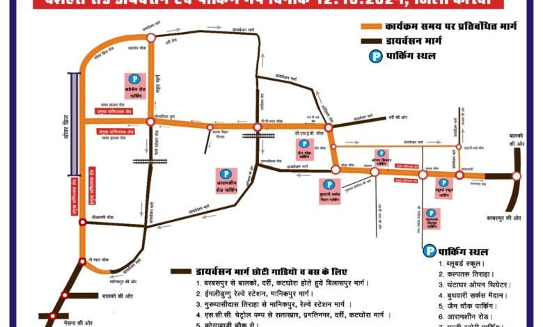 पुलिस के द्वारा एक मैप जारी किया गया है जिसमें बताया गया है कि बड़ी गाडी सुबह 05 बजे से रात 12 बजे तक प्रतिबंधित रहेंगी। जिसके लिये निम्न डायवर्सन पॉइंट लगाया गया है।