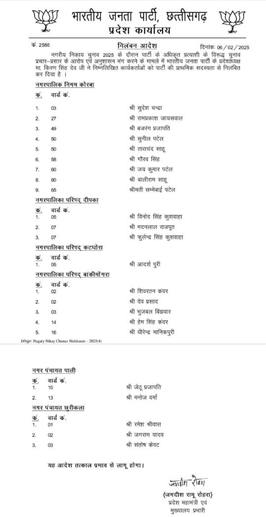 नगरीय निकाय चुनाव :कोरबा में BJP के बागियों पर हुई कार्रवाई,6 साल के लिए पार्टी ने किया निष्कासित ,देखें किन पर गिरी गाज