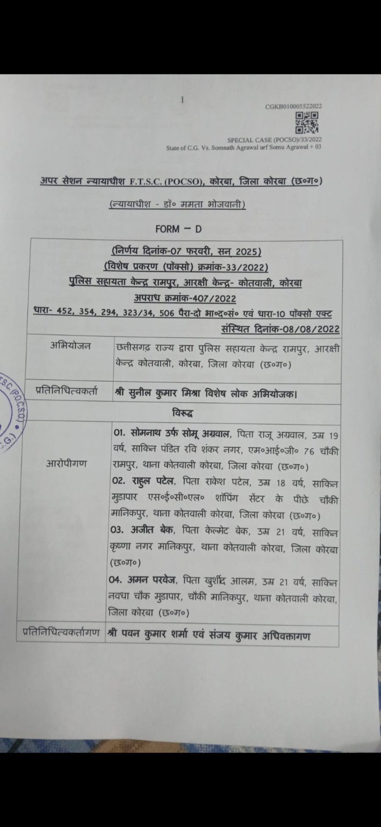 अपर सत्र न्यायाधीश एफटीएससी पाक्सो के न्यायालय ने दिया फैसला
