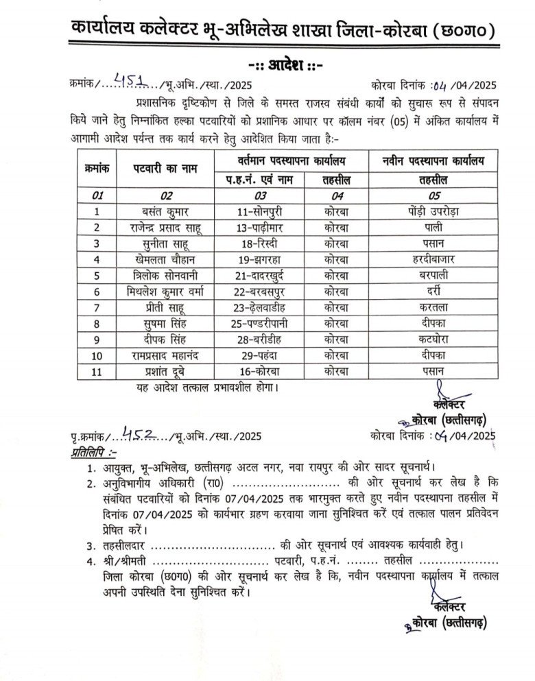 कलेक्टर श्री अजीत वसंत ने जिले के अलग-अलग तहसीलों में लंबे समय से पदस्थ पटवारियों को प्रशासनिक दृष्टिकोण से एक तहसील से दूसरे तहसील में तबादला किया है। उन्होंने तहसील कोरबा के 11, अजगरबहार के 5, भैंसमा के 8, बरपाली के 13, करतला के 8, दीपका के 8, कटघोरा के 12, दर्री के 8, हरदीबाजार के 10, पाली के 13, पोड़ी उपरोड़ा के 21, और पसान के 8 पटवारियों कुल 125 पटवारियों का स्थानान्तरण अलग-अलग तहसीलों में किया है। उन्होंने संबंधित पटवारियों को 7 अप्रैल 2025 तक कार्य भार ग्रहण करने के आदेश दिए हैं