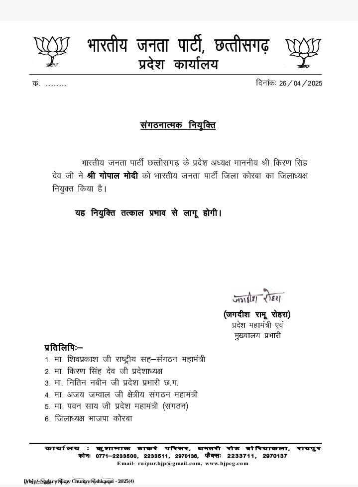 एक्सक्लूसिव कोरबा बिग ब्रेकिंग न्यूज़,,, गोपाल मोदी बने भाजपा जिलाध्यक्ष admin Admin posted on 9 months ago 487 views अभी अभी जारी हुआ आदेश देखिये आदेश की NA YOUR REACTION? 0 AWESOME! 0 NICE 0 LOVED 0 LOL 0 FUNNY 0 FAIL! 0 OMG! 0 EW!