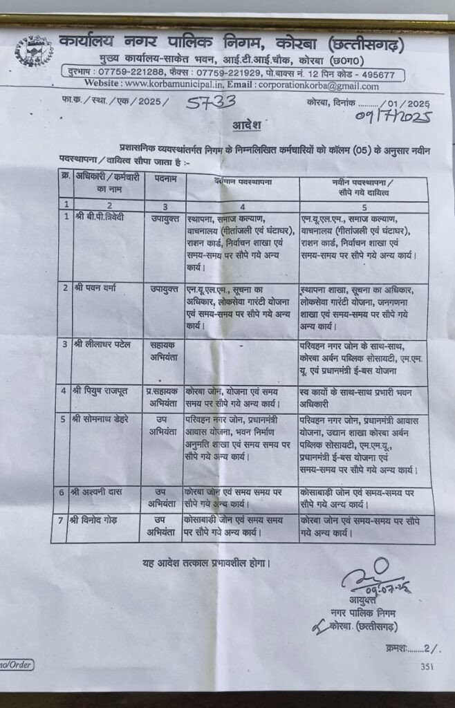 कोरबा। नगर पालिक निगम आयुक्त आशुतोष पांडेय ने नगर पालिक निगम के दो उपायुक्त समेत सात अधिकारियों की पदस्थापना में फेरबदल किया है। उन्हें उनके कार्य दायित्व के साथ-साथ नवीन जिम्मेदारियां भी सौंपी गई है।