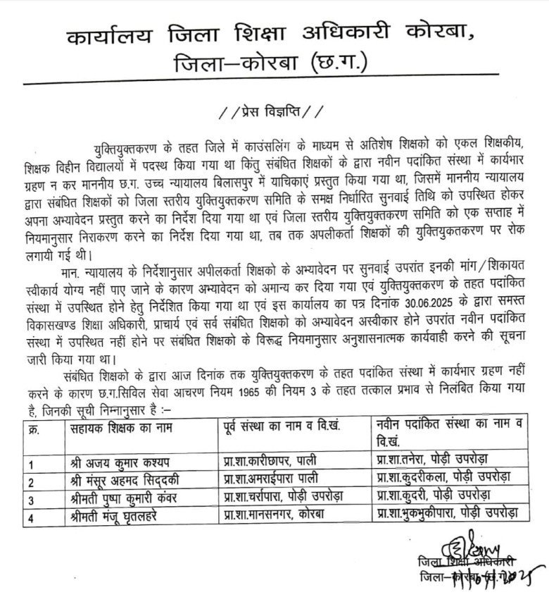 कोरबा। जिला शिक्षा अधिकारी टीपी उपाध्याय ने 2 शिक्षिका सहित कुल 4 शिक्षकों को निलम्बित कर दिया है।कार्यभार ग्रहण नहीं करने के कारण और बार-बार नोटिस के बाद भी ज्वाइनिंग नहीं वाले इन शिक्षकों पर अनुशासनात्मक कार्रवाई करते हुए निलंबित किया गया है।