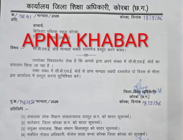 उनका तर्क है कि बच्चों ने पूरे वर्ष सीबीएसई सिलेबस के तहत पढ़ाई की है, ऐसे में अब पाठ्यक्रम बदलकर परीक्षा देने का दबाव अनुचित है और इससे छात्रों पर मानसिक दबाव भी बढ़ रहा है।मामले की गंभीरता को देखते हुए जिला शिक्षा अधिकारी कार्यालय, कोरबा ने 18 मार्च 2026 को स्कूल के प्राचार्य को नोटिस जारी किया। नोटिस में स्पष्ट निर्देश दिया गया है कि स्कूल सीबीएसई बोर्ड से प्राप्त मान्यता से संबंधित सभी दस्तावेज दो कार्य दिवस के भीतर प्रस्तुत करे।