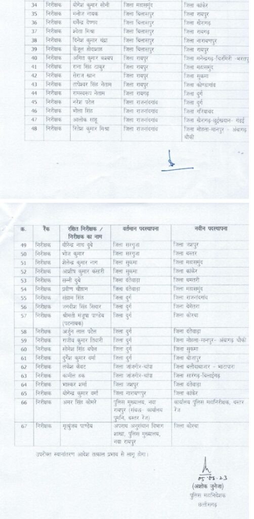अभी अभी जारी हुई निरीक्षकों की तबादला सूची: चंद्रवंशी सक्ती, अभय बिलासपुर तो आशीष नारायणपुर भेजे गए, अभी और भी निरीक्षक जायेंगे दूसरे जिले