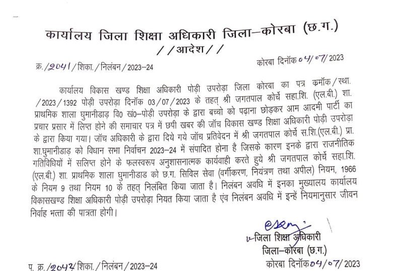 बता दें कि इससे पहले जिले के ही पोड़ी-उपरोड़ा विकासखण्ड के ग्राम पंचायत घुमानीडांड के शासकीय प्राथमिक शाला में पदस्थ सहायक शिक्षक (एलबी) जगतपाल कोर्चे को आम आदमी पार्टी का प्रचार प्रसार करने का दोषी पाए जाने पर जिला शिक्षाधिकारी ने अनुशासनात्मक कार्रवाई करते हुए निलंबन किया है।