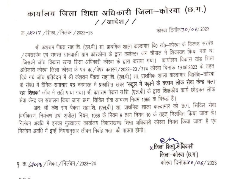 कोरबा जिले में एक और सहायक शिक्षक पर निलंबन की गाज गिरी है। कोरबा विकासखंड के ग्राम कल्दामार शासकी