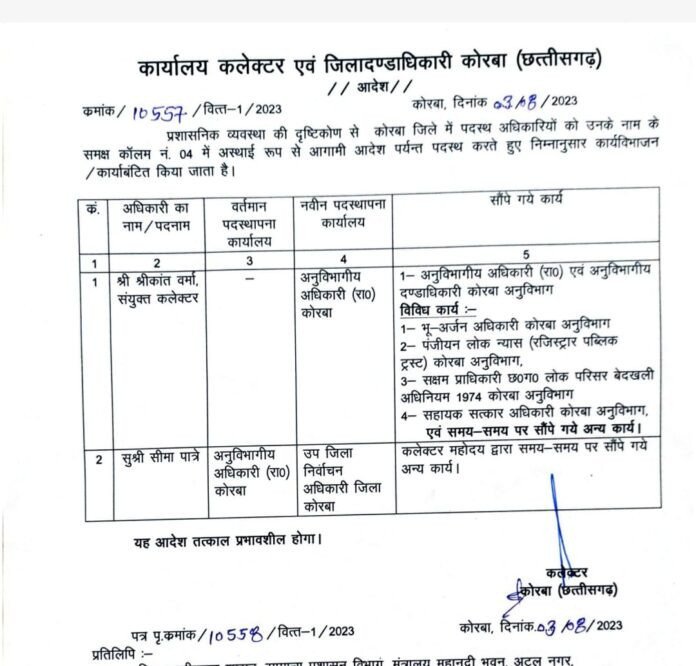 श्रीकांत वर्मा होंगे कोरबा SDM..कलेक्टर ने जारी किया आदेश, सीमा पात्रे अब देखेंगे...
