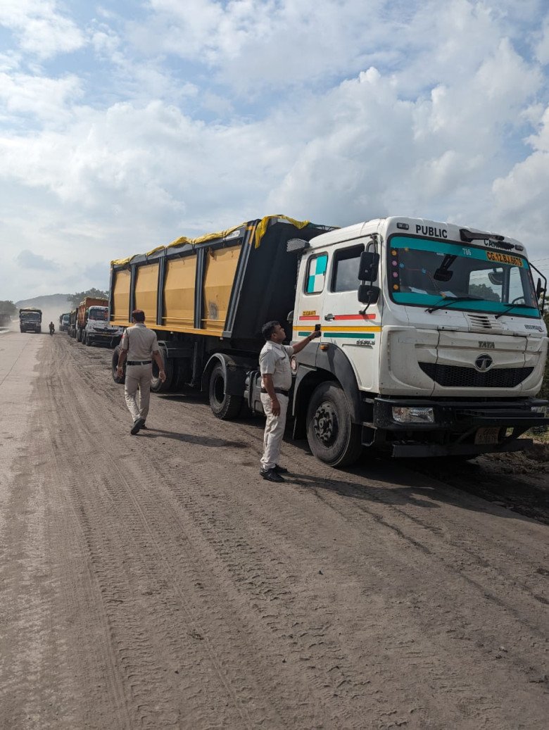 सड़क पर बेतरतीब खड़े भारी वाहनों पर की गई कार्यवाही, 25 वाहनों से वसूला गया 35400 रूपए जुर्माना
