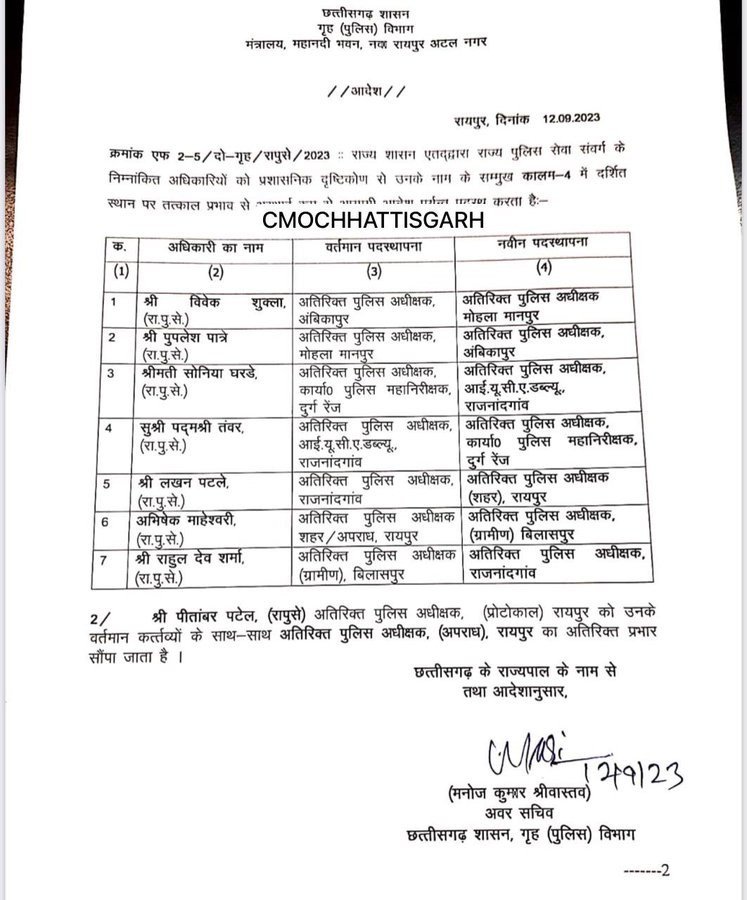 राहुल देव शर्मा को मिली नई जवाबदारी, ब्रेकिंग एडिशनल एसपी राज्य शासन द्वारा राज्य पुलिस सेवा के अधिकारियों के नवीन पदस्थापना आदेश जारी