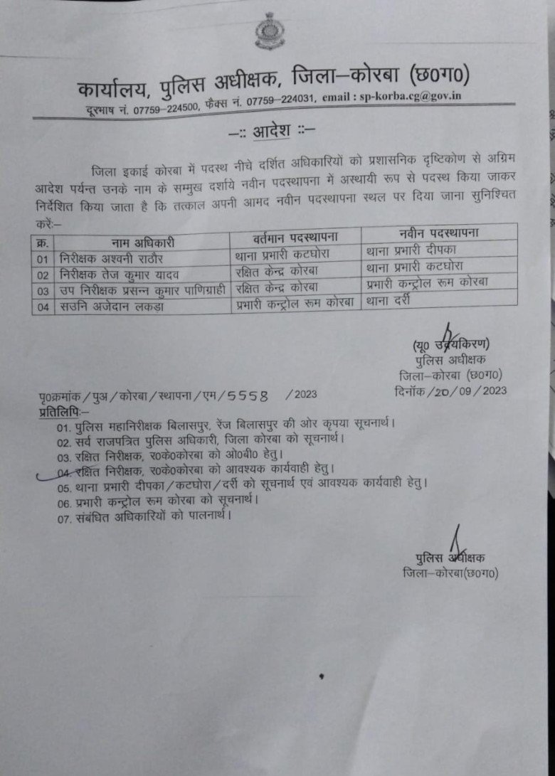 बिग ब्रेकिंग कोरबा : 4 पुलिसकर्मियों का तबादला, SP ने जारी किया आदेश…इन्हे मिला दीपका TI का प्रभार