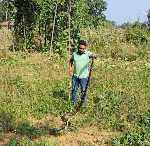 कोरबा वन मण्डल के पसरखेत रेंज में मिला 12 फिट का किंग कोबरा,घर के बाड़ी में बैठे देखा तो घर वालों के होश उड़ गए, वन विभाग के रेस्क्यू टीम ने किया रेस्क्यू
