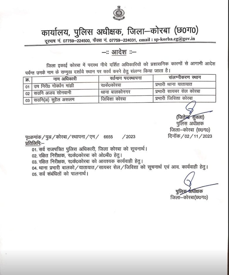 कोरबा ब्रेकिंग : SP ने किया ट्रांसफर आदेश जारी.. अजय सोनवानी को सायबर का प्रभार