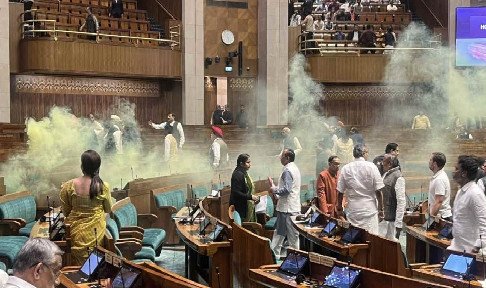 संसद पर आतंकी हमले की 22वीं बरसी पर सदन में उस वक्त अफरातफरी मच गई, जब विजिटर्स गैलरी से 2 युवक अचानक नीचे कूद गए। उस समय लोकसभा में बीजेपी सांसद खगेन मुर्मू अपनी बात रख रहे थे। वे सदन की बेंच पर कूदने लगे। युवकों ने जूते में कुछ स्प्रे छिपा रखा था। उसे निकालकर स्प्रे किया, जिससे सदन में पीला धुआं फैलने लगा।