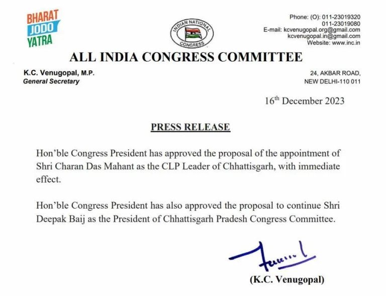 चरणदास महंत होंगे नेता प्रतिपक्ष, दिल्ली से आई चिट्ठी... बैज बने रहेंगे पीसीसी चीफ