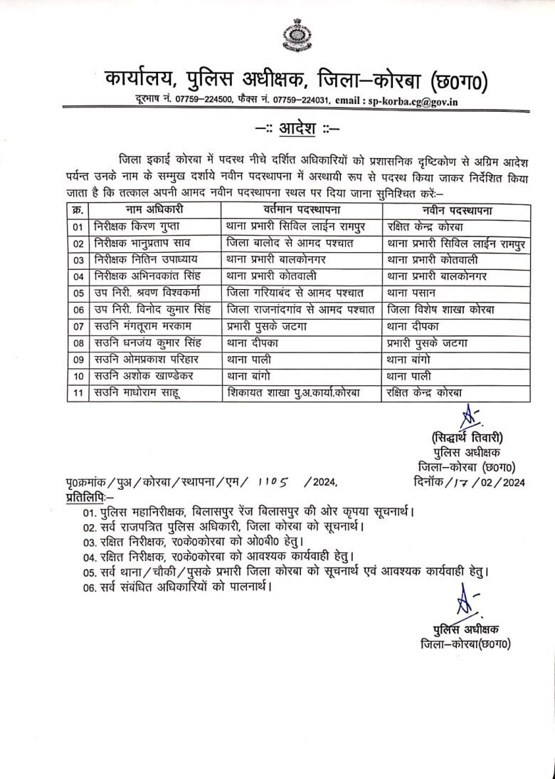पुलिस अधीक्षक सिद्धार्थ तिवारी ने किया फिर बदल नितिन उपाध्याय बनाए गए कोतवाली प्रभारी और अभिनव कांत बने बालकों के Ti