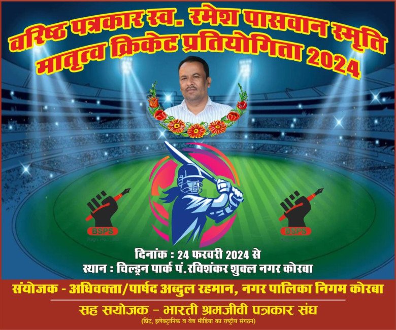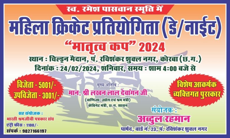 मातृत्व कप 2024: स्व. रमेश पासवान की स्मृति में महिला क्रिकेट प्रतियोगिता का आयोजन.. कैबिनेट मंत्री लखन लाल देवांगन करेंगे शुभारंभ