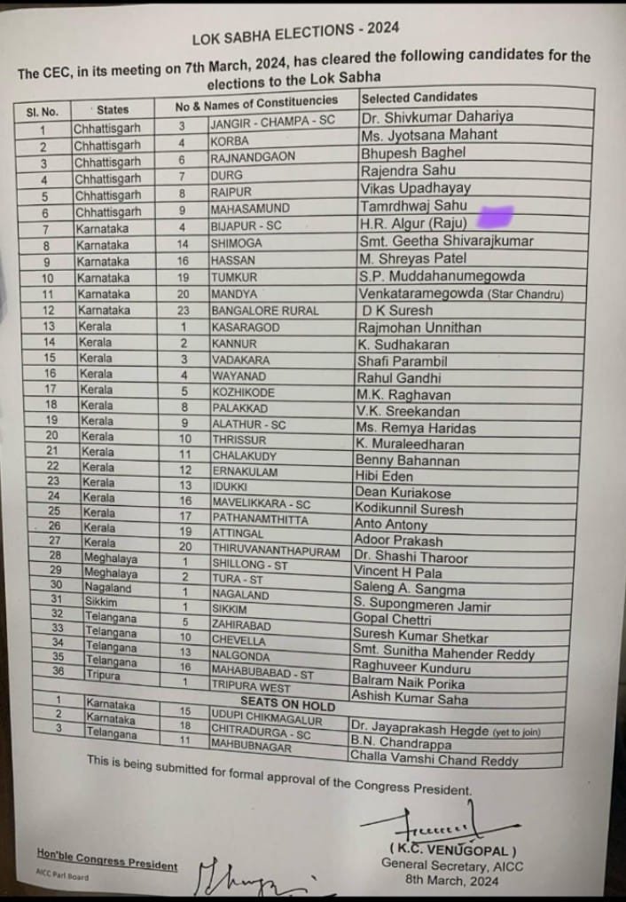छत्तीसगढ़ के 6 लोकसभा प्रत्याशी की लिस्ट कांग्रेस ने जारी किया,कोरबा लोकसभा क्षेत्र से ज्योत्सना चरणदास महंत