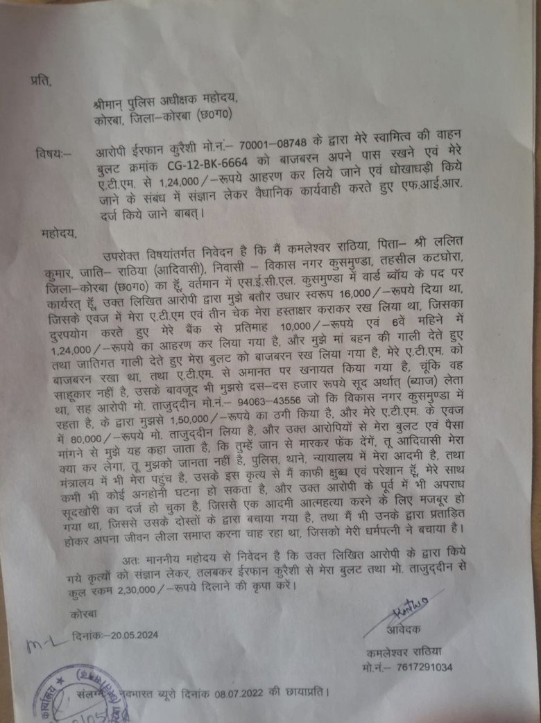 प्रार्थी कमलेश्वर राठिया पिता ललित कुमार विकास नगर कुसमुण्डा का निवासी है और एस.ई.सी.एल. कुसमुण्डा अस्पताल में वार्ड ब्वॉय है। उसने उधार स्वरूप 16 हजार रूपये इरफान कुरैशी से लिया था। उधार के एवज में एटीएम एवं तीन चेक हस्ताक्षर कराकर रख लिया गया था, जिसका दुरूपयोग करते हुए बैंक से प्रतिमाह 10 हजार रूपये एवं 6वें महिने में 1 लाख 24 हजार रुपए का आहरण इरफान द्वारा कर लिया गया। आरोप है कि उधार के बदले काफी ज्यादा रकम ले लेने के बाद भी जातिगत गाली देते हुए बुलेट वाहन क्रमांक सीजी-12बीके-6664 को इरफान ने जबरन अपने पास रख लिया और एटीएम को भी वापस नहीं कर रहा।
