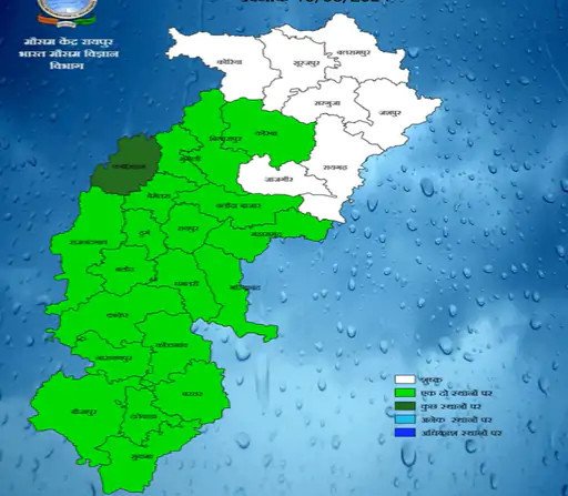 रायपुर, बलौदाबाजार, गरियाबंद, धमतरी, महासमुंद, बिलासपुर, पेंड्रा, मुंगेली, कोरबा, दुर्ग, बालोद, बेमेतरा, कबीरधाम, राजनांदगांव, बस्तर, कोंडागांव, दंतेवाड़ा, सुकमा, कांकेर, बीजापुर, नारायणपुर में बूंदाबांदी के आसार हैं। अगले 5 दिनों में प्रदेश में अधिकतम तापमान में 2-3°C की बढ़ोतरी होगी।
