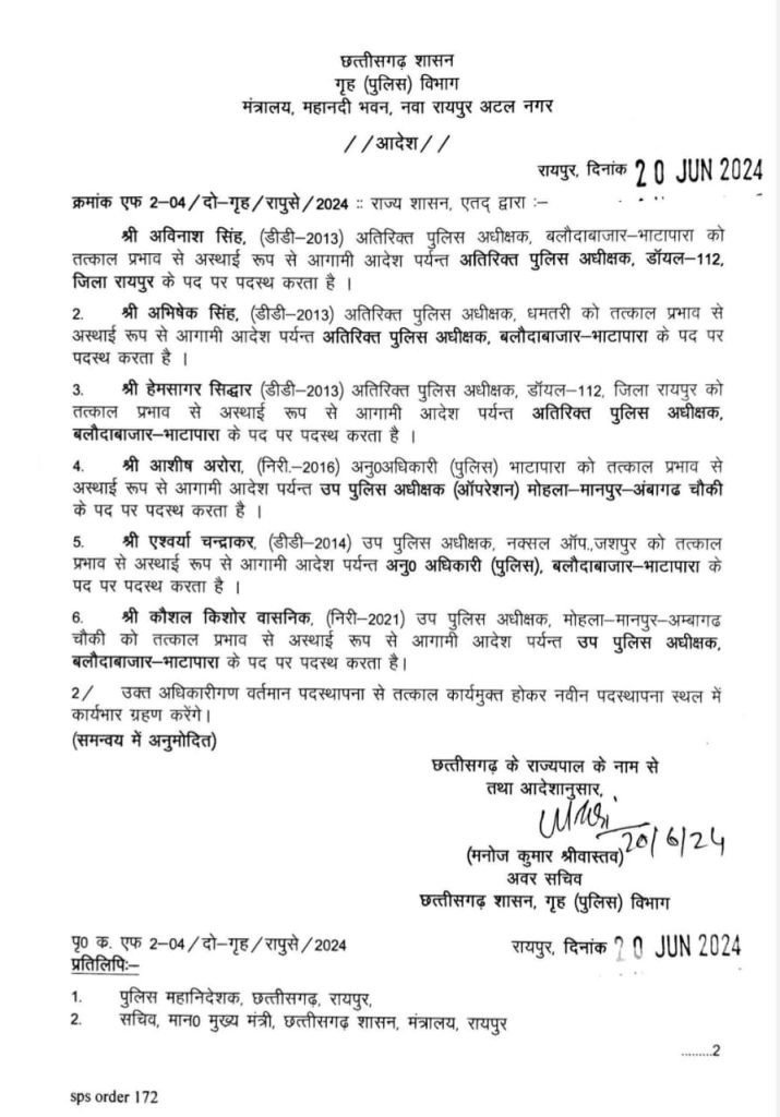 CG BREAKING : कलेक्टर-एसपी के बाद अतिरिक्त पुलिस अधीक्षक, एसडीओपी और डीएसपी का हुआ तबादला, देखिए पूरी सूची…