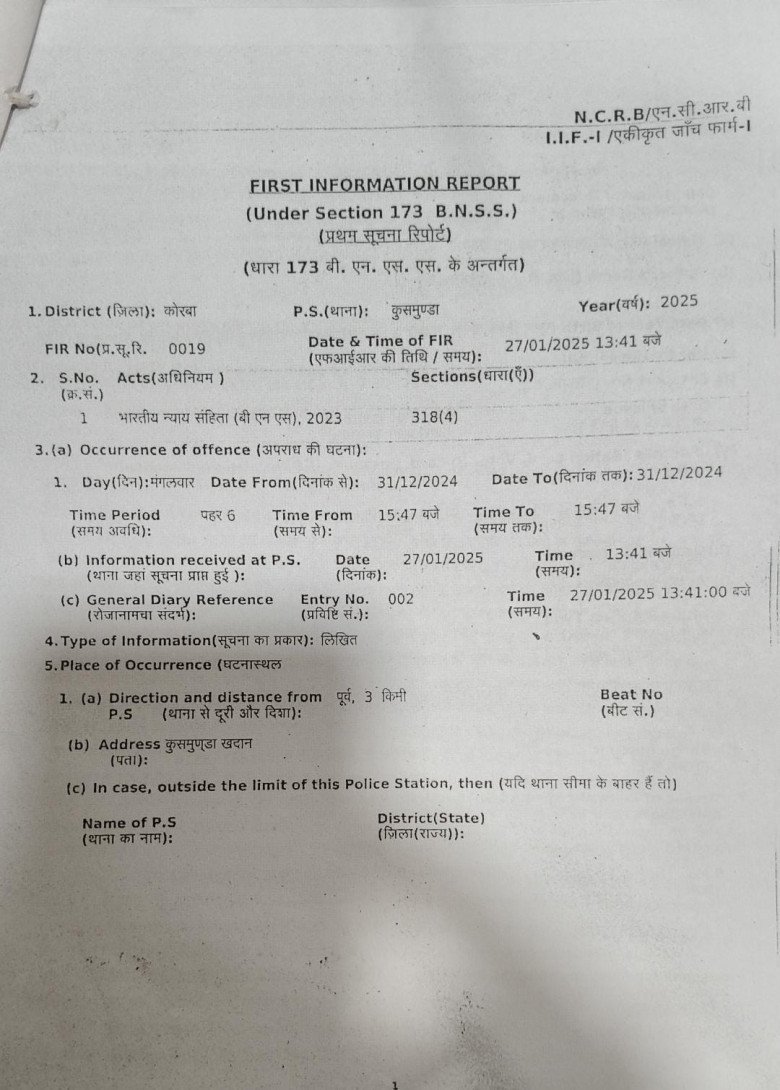 इस मामले में कुसमुंडा थाना पुलिस ने अभय सिंघानिया और चालक दीनदयाल के खिलाफ अपराध क्रमांक 19/2025 के तहत भारतीय दंड संहिता (बीएनएस) 2023 की धारा 318(4) में मामला दर्ज किया है। पुलिस आगे की जांच कर रही है।