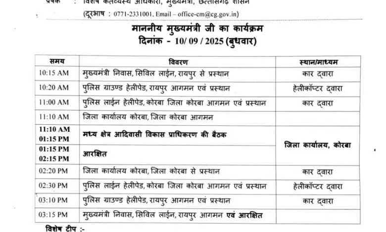 कोरबा Korba Breaking: सुबह 11 बजे पुलिस लाइन में उतरेगा CM का हेलीकॉप्टर, मिनट टू मिनट कार्यक्रम जारी… admin Admin posted on 4 months ago 215 views जारी हुआ प्रोटोकॉल देखिये प्रोटोकॉल,,,,, NA YOUR REACTION? 1 AWESOME! 0 NICE 0 LOVED 0 LOL 0 FUNNY 0 FAIL! 0 OMG! 0 EW!