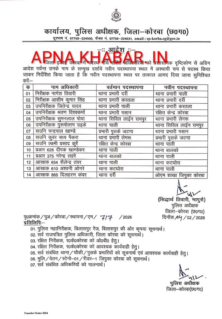 कोरबा कोरबा एसपी ने किया फेरबदल..... कौन कहाँ गया देखिये सूची admin Admin posted on 3 days ago 559 views 2 टीआई और ये सब कोरबा पुलिस अधीक्षक ने फेरबदल करते हुए किसको कहां भेजा देखीये सूची NA YOUR REACTION? 0 AWESOME! 0 NICE 0 LOVED 0 LOL 0 FUNNY 0 FAIL! 0 OMG! 0 EW!