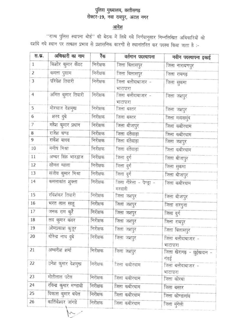 प्रदेश स्तर पर नगर निरीक्षकों का तबादला पुलिस मुख्यालय द्वारा किया गया है इसी कड़ी में कोरबा में पदस्थ नगर निरीक्षक मनीष नगर और अभिनव कांत सिंह का हुआ तबादला मोतीलाल पटेल वापस कोरबा हुए देखिए पूरी सूची