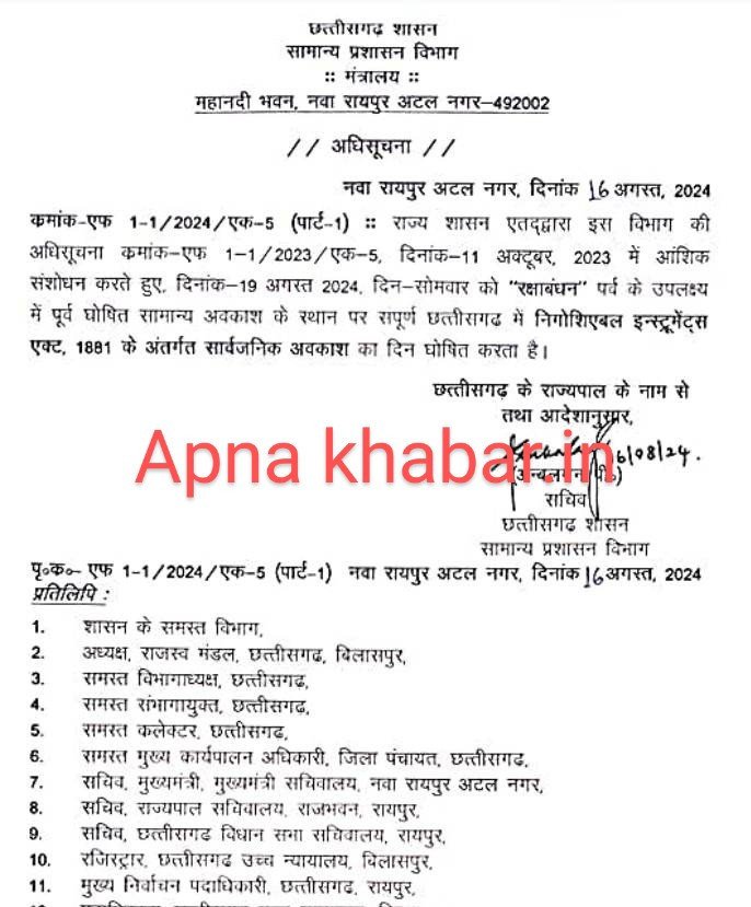 आपको बता दें कि पहले रक्षाबंधन पर सामान्य अवकाश घोषित किया गया था. अब सामान्य प्रशासन विभाग छग शासन ने 11 अक्टूबर 2023 को जारी अधिसूचना में आंशिक संशोधन करते हुए 19 अगस्त को सार्वजनिक छुट्टी का आदेश जारी कर दिया है.