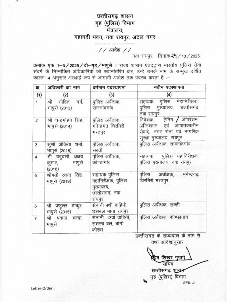 रायपुर। राज्य सरकार ने आईपीएस अधिकारियों का तबादला किया है, जारी आदेश में 7 आईपीएस अधिकारियों के नाम शामिल है। कई जिलों के एसपी बदले गए है।