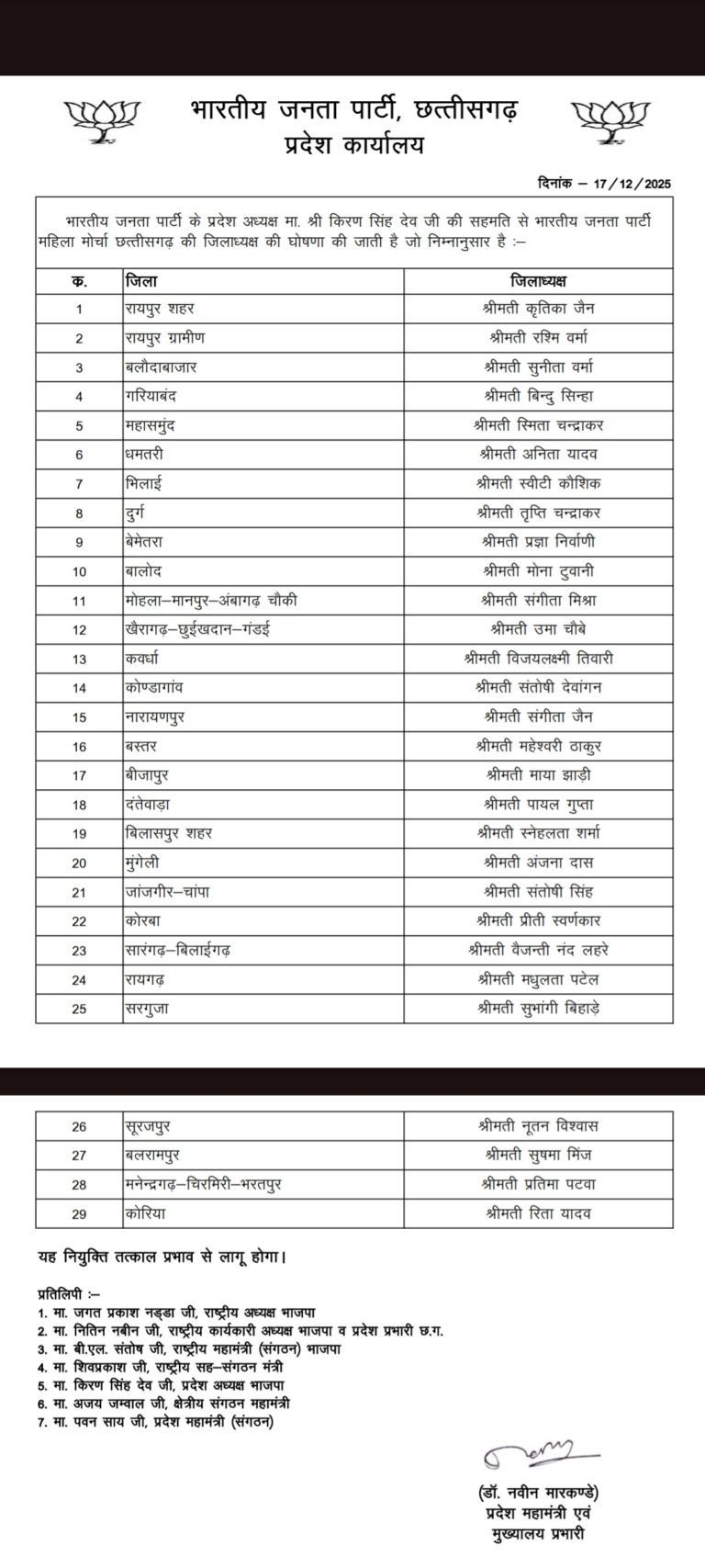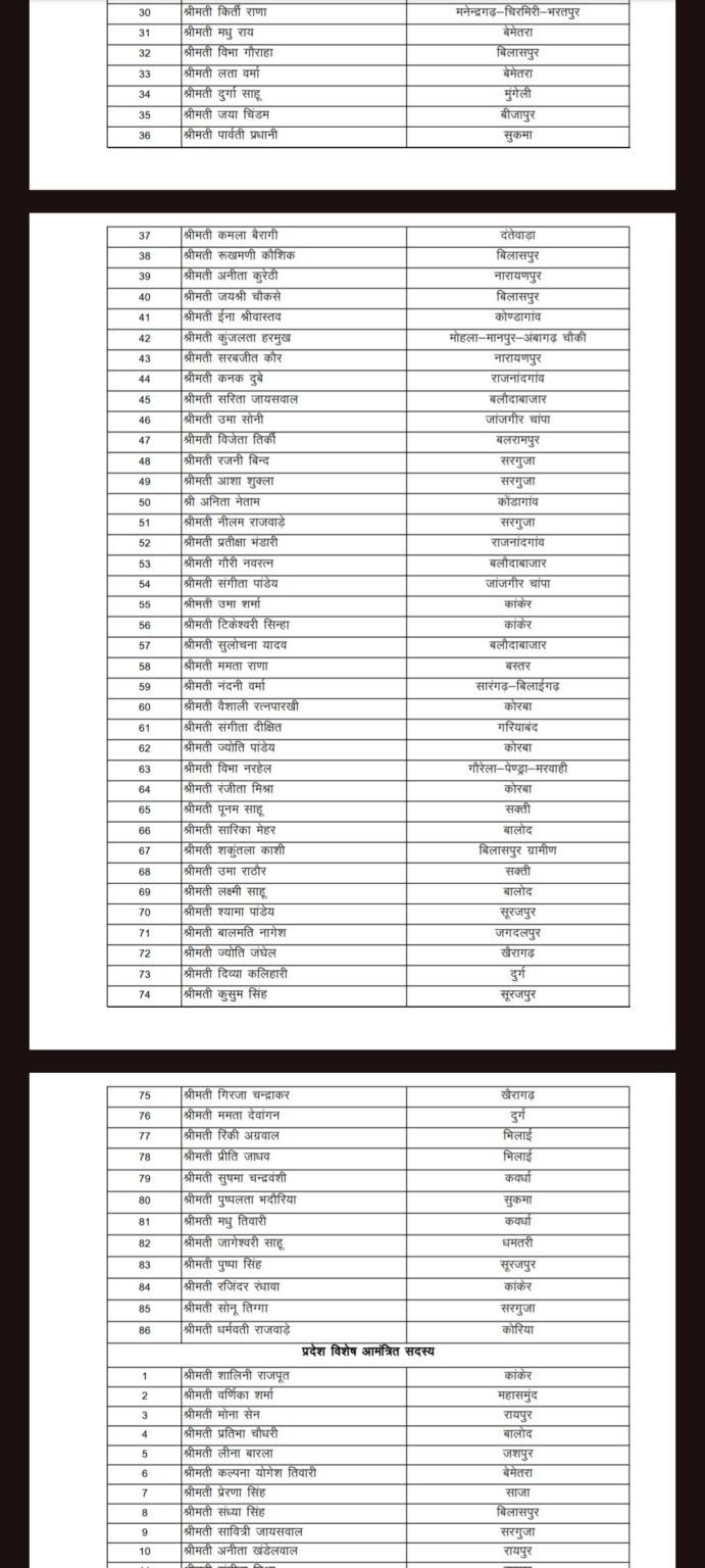 रायपुर/कोरबा। भारतीय जनता पार्टी संगठन के द्वारा प्रदेश महिला कार्य समिति की घोषणा कर दी गई है। इसके साथ ही जिलाध्यक्ष भी घोषित कर दिए गए हैं। कोरबा जिले में श्रीमती प्रीति स्वर्णकार को जिलाध्यक्ष की जिम्मेदारी सौंपी गई है। प्रदेश कार्यकारिणी में भी कोरबा जिले को तवज्जो मिली है।